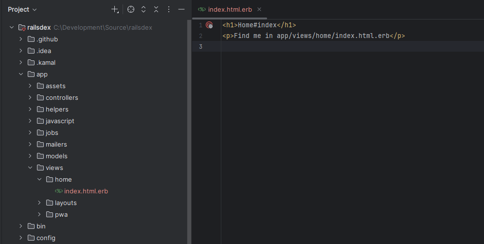 Now, using your favourite IDE, open the view file located at /app/views/home/index.html.erb: