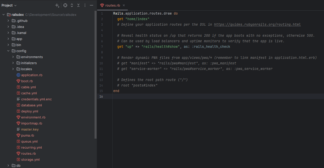 Next, we’ll make the Home page the default page users see when they visit the app. To do that, open the configuration file responsible for routing all user requests. The name? routes.rb (aha!) it is located at /config/routes.rb: