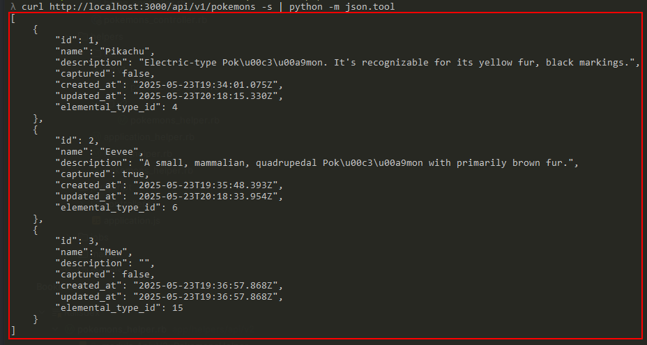 First, let’s call the API to list all Pokémons currently available in Railsdex:curl http://localhost:3000/api/v1/pokemons