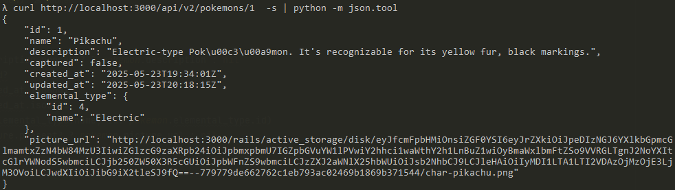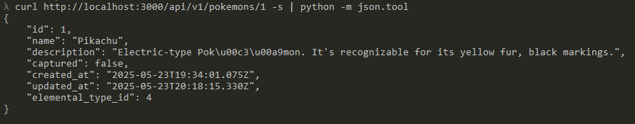 Now, what about retrieving the details of a specific Pokémon? Just run:curl http://localhost:3000/api/v1/pokemons/1