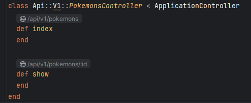 The command creates a versioned controller named PokemonsController with methods index and show under namespace api/v1. Also, notice the optional parameter --no-template-engine used to avoid the creation of views as this is an API-only controller.